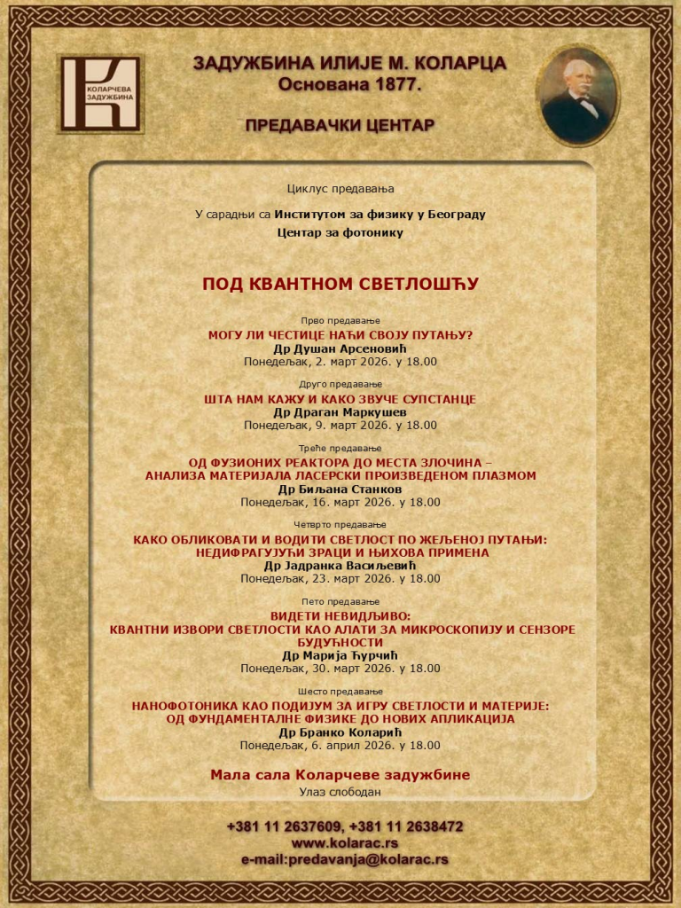 У оквиру серије предавања о фотоници коју организују Институт за физику у Београду и Задужбина Илије М. Коларца, у понедељак, 9. марта 2026. године у 18 часова у Малој сали Коларчеве задужбине, др Драган Маркушев (Институт за физику у Београду) одржаће предавање: